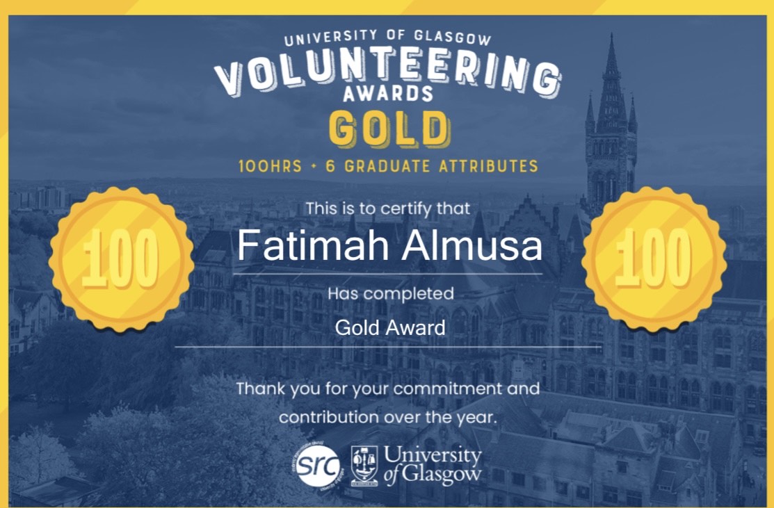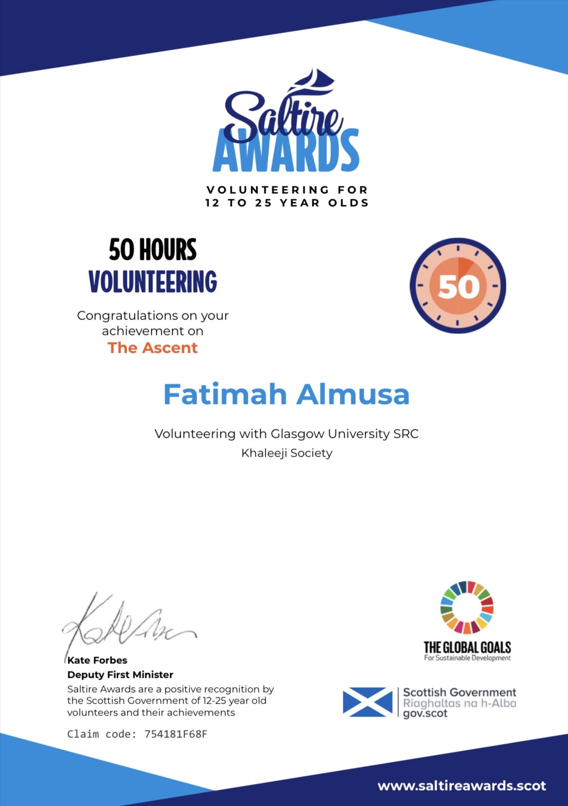 In recognition of her volunteer work, Fatimah was awarded the Bronze, Silver, and Gold Volunteering Awards, having contributed over 100 hours of service. She also received the prestigious Saltire Award, presented by the Scottish Government to honour the achievements of young volunteers in Scotland.