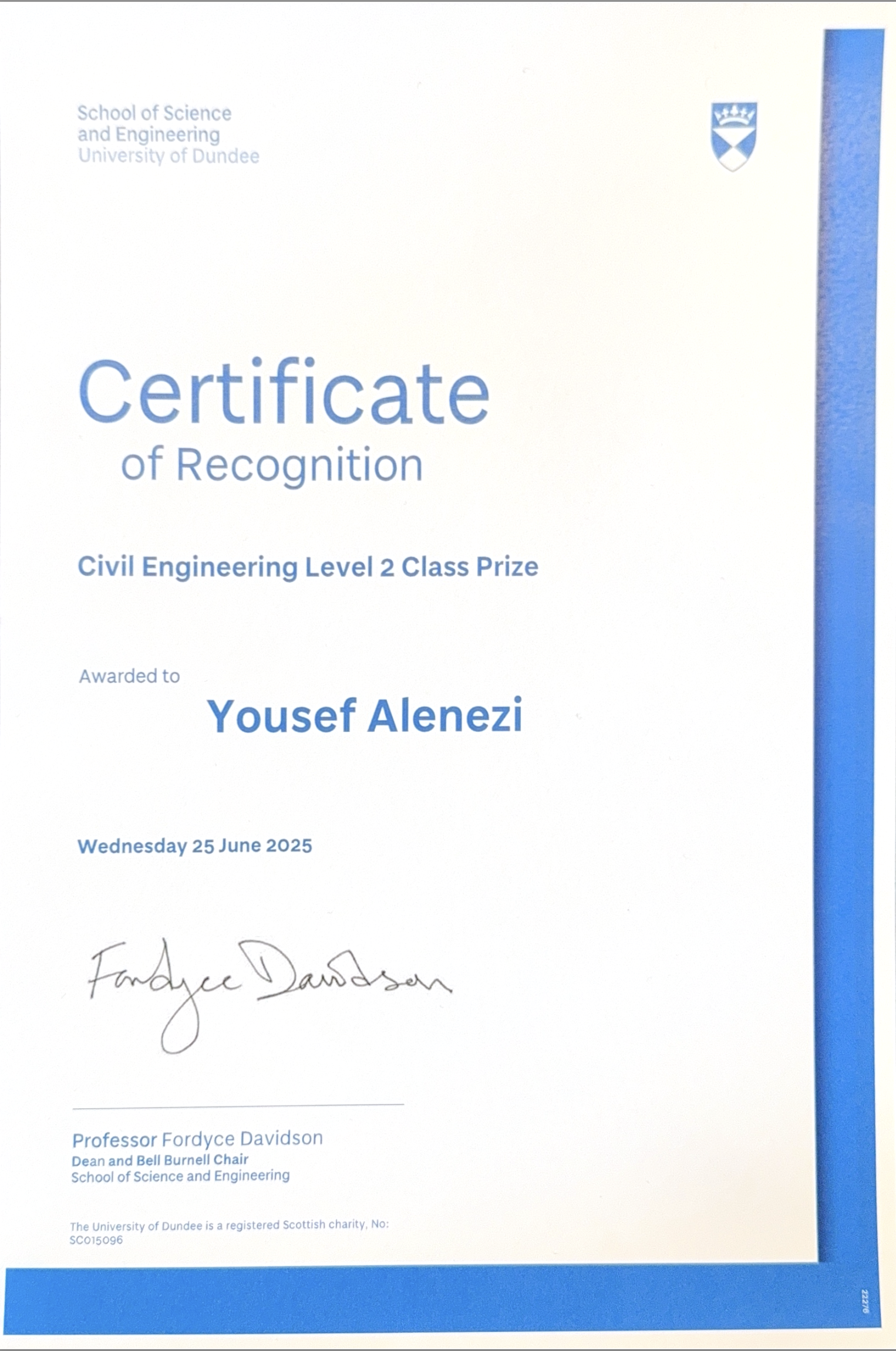 The Kuwait Cultural Office is delighted to highlight the achievement of Mr. Yousef Alenezi, Civil and Structural Engineering student at the University of Dundee, who has been awarded the Class Prize Level 2 in Civil Engineering during the 2024–2025 Summer Prize Awards.