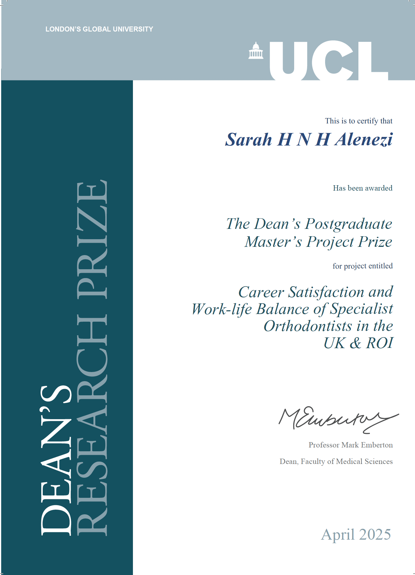 Awarded in April 2025, this prestigious honour reflects Sarah’s academic excellence, dedication, and contribution to advancing clinical dental research at UCL.